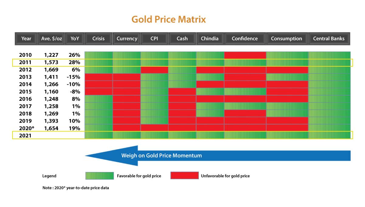 Nämä kaikki synnyttävät kullalle aurinkoisempia näkymiä oman talouden turvasatamana. SBMA esittelee myös kullan hintamatriisin, jonka kahdeksan tekijää näyttäytyvät kullalle suosiollisina vuonna 2021: